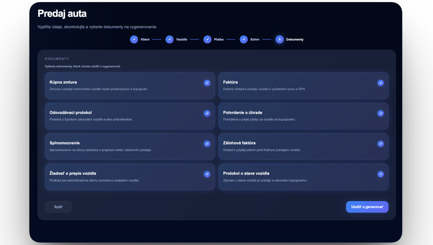 Systém pre výkup a predaj vozidiel, ktorý automaticky pripraví dokumenty, uloží celý obchod do histórie a udrží všetko prehľadne na jednom mieste.